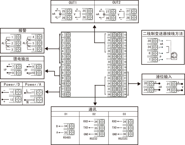 | X D1 D2 D3 | 無輸出 RS-485通迅接口(Modbus) RS232通迅接口(Modbus) RS232C打印接口 | X 1P 2P | 無輸出 1路饋電輸出 2路饋電輸出 如“2P(12/24)”表示第一路12V,第二路24V饋電輸出。 |