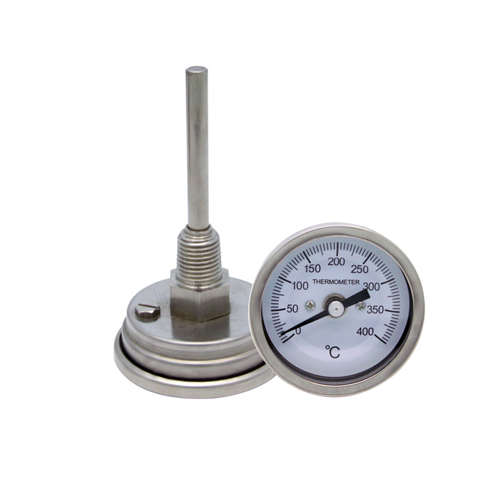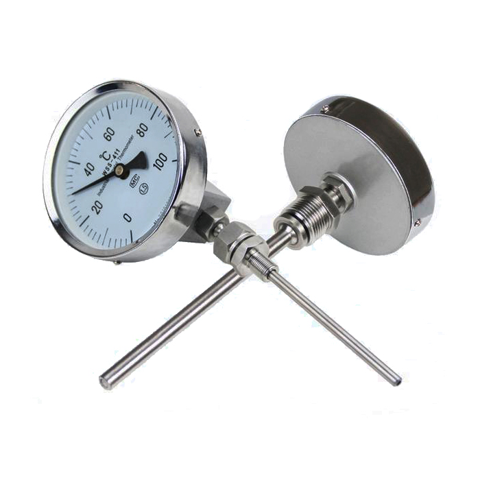 工業(yè)用雙金屬溫度計主要的元件是一個用兩種或多種金屬片疊壓在一起組成的多層金屬片。為提高測溫靈敏度,通常將金屬片制成螺旋卷形狀。當多層金屬片的溫度改變時,各層金屬膨脹或收縮量不等,使得螺旋卷卷起或松開。由于螺旋卷的一端固定而另一端和一可以自由轉(zhuǎn)動的指針相連,因此,當雙金屬片感受到溫度變化時,指針即可在一圓形分度標尺上指示出溫度來。這種雙金屬溫度計儀表的測溫范圍是200~650℃,允許誤差均為標尺量程的1%左右。